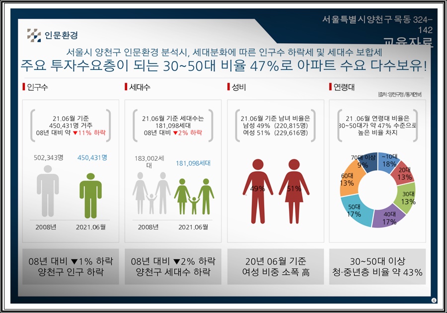 목동 센텀스카이 서울시(서울市) 양천구는 주택구매력(住宅購買力)이 높고 부동산(不動産) 수요(需要)의 핵심(核心) 연령층(年齡層)인 30~50대(代)의 비율(比率)이 약(約) 50퍼센트에 육박(肉薄)하는데요. 인구수(人口數)는 지나온 2008년(年) 대비(對備) 11퍼센트 하락(下落)한 수준(水準)이지만 세대수(世代數)는 2퍼센트하락(下落)에 그쳤습니다. 이와 같은 통계자료(統計資料)를 통하여 앞으로도 1~2인(人) 가구(家口)의 세대수(世帶數)는 늘어날 예상(豫想)이며 소형평형대(小型坪型臺) 상품(商品)이 향후(向後) 부동산(不動産) 시장(市場)을 리딩할 것으로 보이는데요.당 사업지(事業地)는 올림픽 대로(大路)와 서부간선도로(西部幹線道路) 등(等) 도로교통망(道路交通網) 사용(使用)이 자유로워 여의도(汝矣島)와 상암(上岩)DMC, 마곡지구(地區) 등(等) 서울시(서울市) 서부권(西部圈)의 중심(中心) 업무지역(業務地域)의 접근성(接近性)이 아주 뛰어난 편(便)입니다. 서부권(西部圈) 이외(以外)에도 GBD, CBD 등(等) 서울시내(市內)의 업무권역(業務權役)과의 연계성(連繫性)이 우수(優秀)하여 주요(主要) 업무지역(業務地域)의 근로수요(勤勞需要)를 끌어당길 수 있을만한 입지(立地) 환경(環境)을 갖췄습니다.