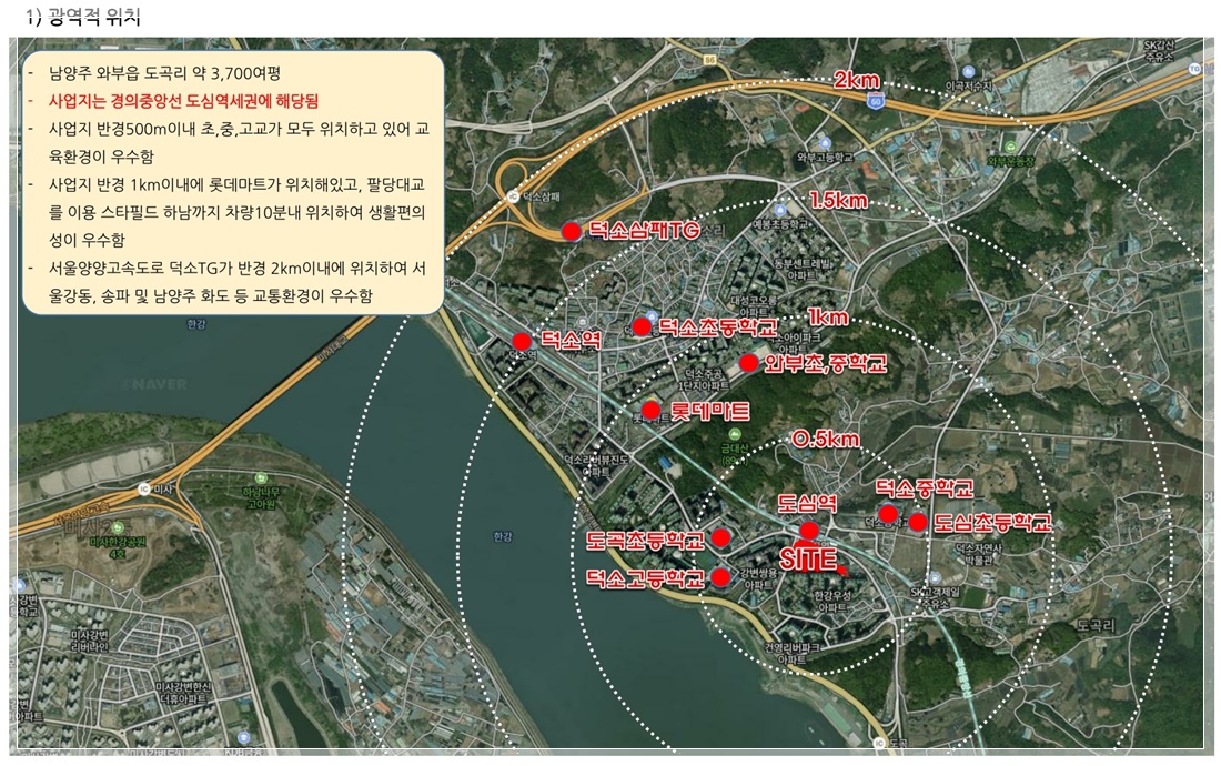 앞으로의 개발(開發) 예상(豫想) 역시(亦是) 밝은 편(便)이라고 하는데요. 우선(于先) 교통(交通)에 관계(關係)한 개발(開發) 호재(好材)를 기대(期待)할 수 있겠습니다. GTX-B 노선(路線)을 비롯하여 4호선(號線) 연장(延長)과 8호선(號線) 복선전철(複線電鐵) 그리고 제(第)2 외곽순화도로(外郭醇化道路)의 완성(完成) 등(等) 앞으로 해당(該當) 권역(圈域)으로의 유입(流入)이 더 많을 것으로 예상(豫想)되는데요.그와 함께 상업(商業) 시설(施設) 또 더욱 발전(發展)하여 점점(漸漸) 더 살기 편(便)한 거주지(居住地)로 거듭나리라 예측(豫測)됩니다. 해당(該當) 물건(物件)의 경우(境遇)에는에는 인기도(人氣度)가 높은 평수도(坪首都) 구성(構成)된 데다가 새롭게 건설(建設)되는 강변(江邊)뷰 A.P.T이기 때문에 굉장(宏壯)한 사람의 발길이 이어질 것으로 예상(豫想)합니다.현재 분.양가는 예상(豫想) 가격(價格)을 바탕으로 진행(進行)하고 있으며, 사업(事業)이 승인(承認)되고 나서 조합원(組合員) 기공(氣功) 총회(總會)를 통하여 확정(確定)될 기획(企劃)입니다. 이에 따라 임대보증금(賃貸保證金)과 임대료(賃貸料)가 결정(決定)되게 됩니다.당 사업지(事業地)는 다른 곳으로 이동(移動)하기 편(便)한 교통여건(交通與件)을 갖추고 있다고 하고 , 삶에 편의(便宜)를 더해주는 인프라가 잘 갖추어진 상황(狀況)입니다. 학습(學習) 여건(與件)을 구성(構成)하기에도 좋고, 덕소재정리촉진지구(再整理促進地區) 7,700세대(世代)가 개발(開發)될 계획(計劃)이라 미래(未來) 예상(豫想)이 밝아 수요(需要)가 더욱 높아지리라 예상(豫想)되는데요.