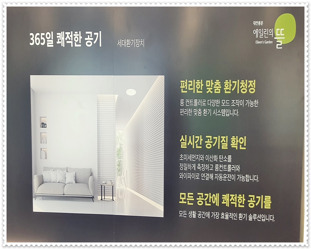 대전 용운동 에일린의뜰 용운 아파트 세대별(世代別)로 드레스룸, 팬트리 등(等) 수납공간(受納空間)을 극대화(極大化)하고 미세(微細)먼지 잡는 클린 에어시스템으로 에어샤워&에어브러쉬를 설치(設置)했다. 편리(便利)한 맞춤 환기청정(喚起淸淨)시스템, 실시간(實時間) 공기질확인(空氣質確認) 등(等) 첨단(尖端) 설비(設備)를 도입(導入)했다.
