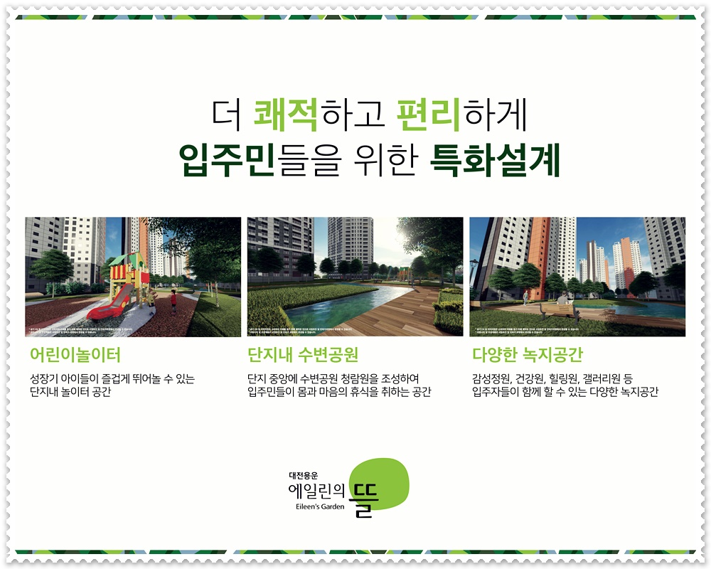 대전 용운동 에일린의뜰 용운 아파트 단지(但只) 중앙(中央) 잔디마당과 어린이놀이터, 정원(庭園) 등(等) 힐링 라이프를 누릴 수 있다. 코인세탁실(洗濯室) 등(等) 생활편의시설(生活便宜施設)이 입점(入店) 예정(豫定)이며 실내(室內)골프연습장(演習場), 피트니스센터 등(等) 입주민(入住民) 전용(專用) 커뮤니티시설(施設)이 조성예정(造成豫定)이다.