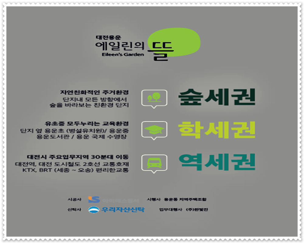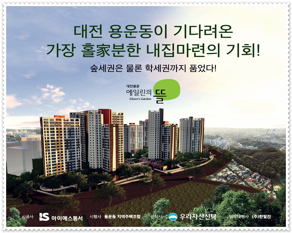 ‘대전 용운동 에일린의뜰 용운 아파트 지역주택조합(地域住宅組合)’은 조합원(組合員) 아파트로 무(無)주택자 또는 전용(專用)85㎡이하(以下) 1채 소유(所有)한 가구주(家口主)로 누구나 신청(申請) 가능(可能)하다. 현재(現在) 자세(仔細)한 위치(位置) 및 조합원(組合員) 자격(資格), 홍보관(弘報館) 예약(豫約) 등(等) 전문상담사(專門相談師)를 통해 안내(案內) 받을 수 있다