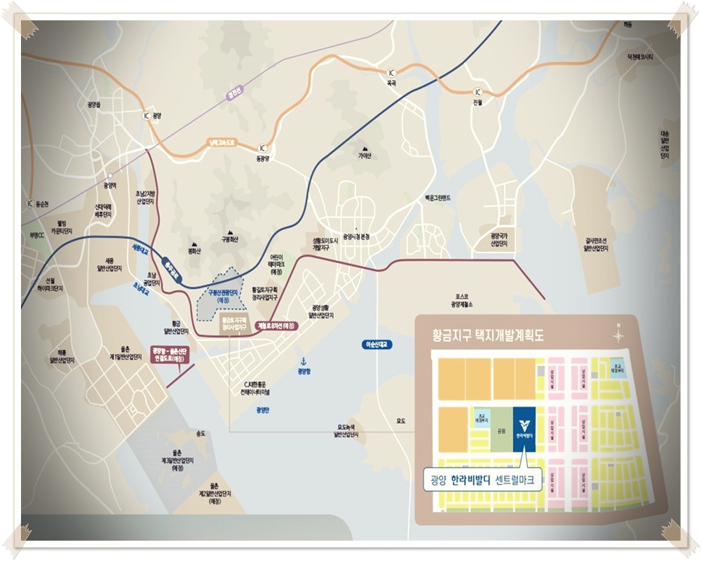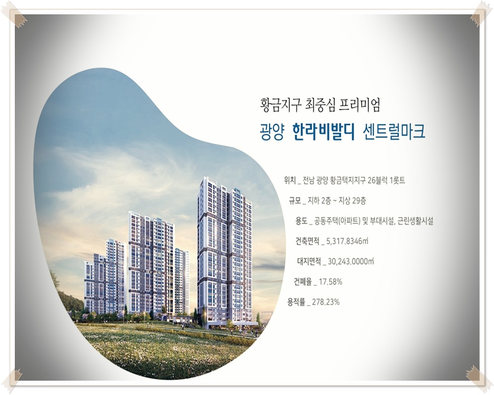 광양권(光陽權)만자유경제구역에 위치(位置)한 산업단지(産業團地)의 배후주거지(背後住居地)로 조성(造成)되고 있는 황금택지지구(黃金宅地地區)에서 처음으로 선보이는 지역조합(地域組合)아파트다. 1군(軍) 건설회사(建設會社)인 (주(株))한라가 시공(施工)을 맡는다. 지난해 조합원(組合員) 모집(募集)과 사업승인(事業承認) 절차(節次)를 마쳤고 이미 착공계(着工屆)까지 제출(提出)하고 현장(現場)을 개설(開設)한 상태(狀態)라 사업(事業) 속도(速度)가 빠르다는 장점(長點)을 갖고 있다. 또한, 분양가(分讓價)가 최근(最近) 분양(分讓)한 민간(民間) 분양(分讓) 아파트보다 저렴(低廉)하다. 입주시기도(入住時期度) 빠른 편(便)이다. 민간(民間)아파트의 경우(境遇) 9월(月)에 분양(分讓)해서 오는 2024년(年) 6월(月)에 입주(入住) 예정(豫定)인데 ‘광양(光陽) 한라비발디 센트럴마크’는 2024년(年) 4월(月)로 2개월가량(個月假量) 빠르다.