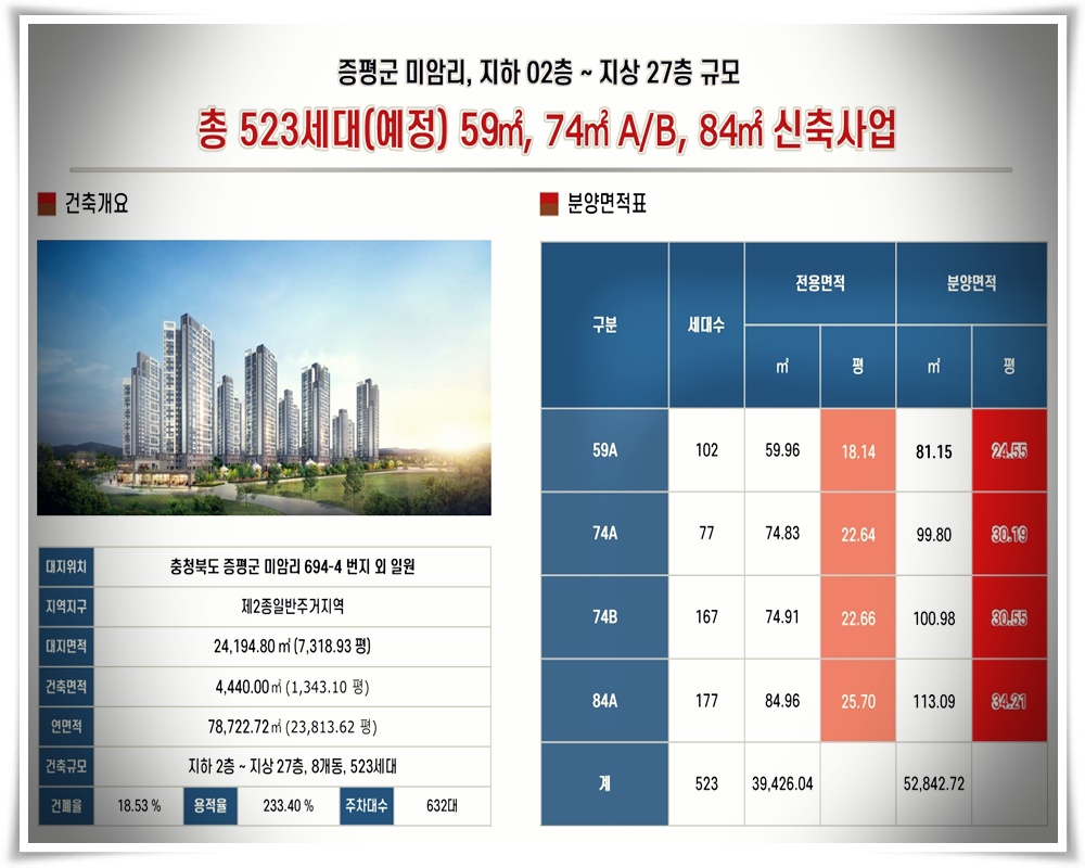 증평 대원칸타빌 아파트 위치(位置)를 보면 미암리 694번지(番地) 일대(一帶)에 들어서며 건축(建築) 규모(規模)로는 지하(地下) 2층(層)에서 지상(地上) 27층(層)까지 들어선다고 합니다 여기에 총(總) 여덟 개(個)의 동(東)이 공급(供給)이 되며 세대수(世代數)를 보면 523 세대(世代)로 구성(構成)을 하고 있습니다 설계(設計)를 하는 타입으로는 송내 가지가 들어선다고 하는데요 59 제곱미터 와 74제곱미터 84 제곱 미터가 있어 실수요자(實需要者)들이 선택(選擇)의 폭(幅)이 넓다고 보시면 됩니다
