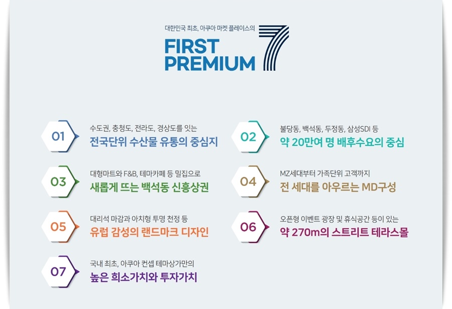 천안라쿠아비바 상가 프리미엄 7가지 수도권 충천도 전라도 경상도를 잇는 전국단위 수산물 유통의 중심지, 약 20만여 명의 배후수요의 중심, 새로게 뜨는 백석동 신흥상권, 천 세대를 아루르고 있는 엠디 구성, 유럽 감성의 랜드마크 디자인, 스트리트 테라스몰, 높은 희소가치와 투자가치의 프리미엄을 이곳에서 누려 보시기 바랍니다.