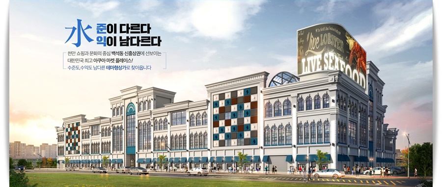 수준이 다르며, 수익이 남다르다 천안 쇼핑과 문의의 중심 백석동 신흥상권에 선보이고 있는 대한민구 최고 아쿠아 마케 플레이스 수준도 수익도 남다른 테마형 상가로 여러분들에게 찾아옵니다.