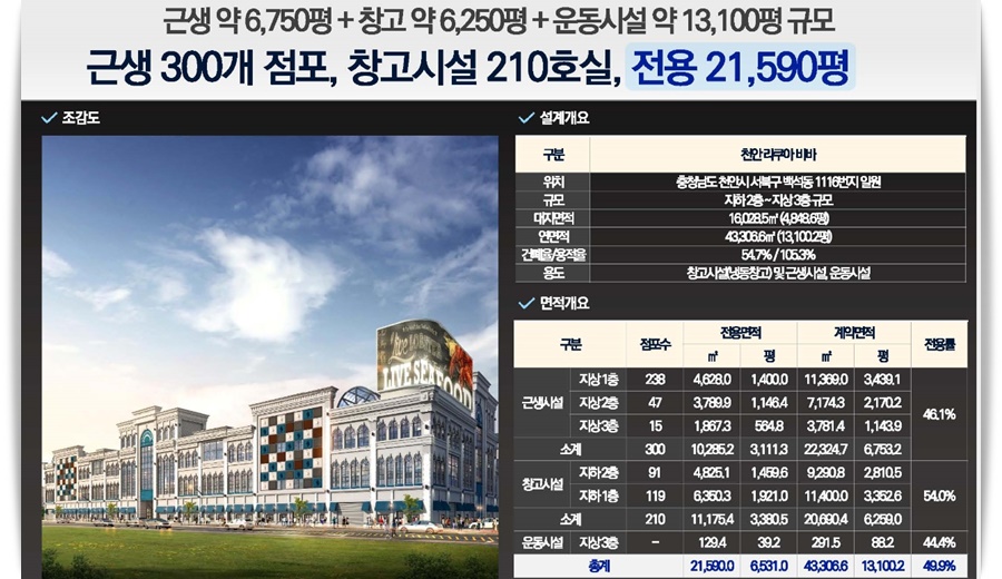 이와 함께 천안 라쿠아비바 백석동 농수산물센터 상가는 지하(地下)에 구성(構成)될 대범위(臺範圍) 물류창고(物流倉庫)를 바탕으로 도매(都賣)를 통(桶)*해 수도권(首都圈)과 충청(忠淸)도, 전라도(全羅道), 경상도(慶尙道)를 연결(連結)하는 교통(交通)의 요충지(要衝地)에 자리한 입지여건(立地與件)을 바탕으로 전국단위(全國單位) 수산물(水産物) 물류(物流) 유통(流通)의 허브 역할(役割)을 수행(遂行)할 것으로 기대(期待)된다고 한답니다. 따라서 ‘라쿠아비바’는 수산물(水産物) 도소매(都小賣) 전체(全體)를 아우르는 신개념(新槪念) 판매(販賣) 플랫폼으로 발돋움할 예상(豫想)이다고 한답니다.