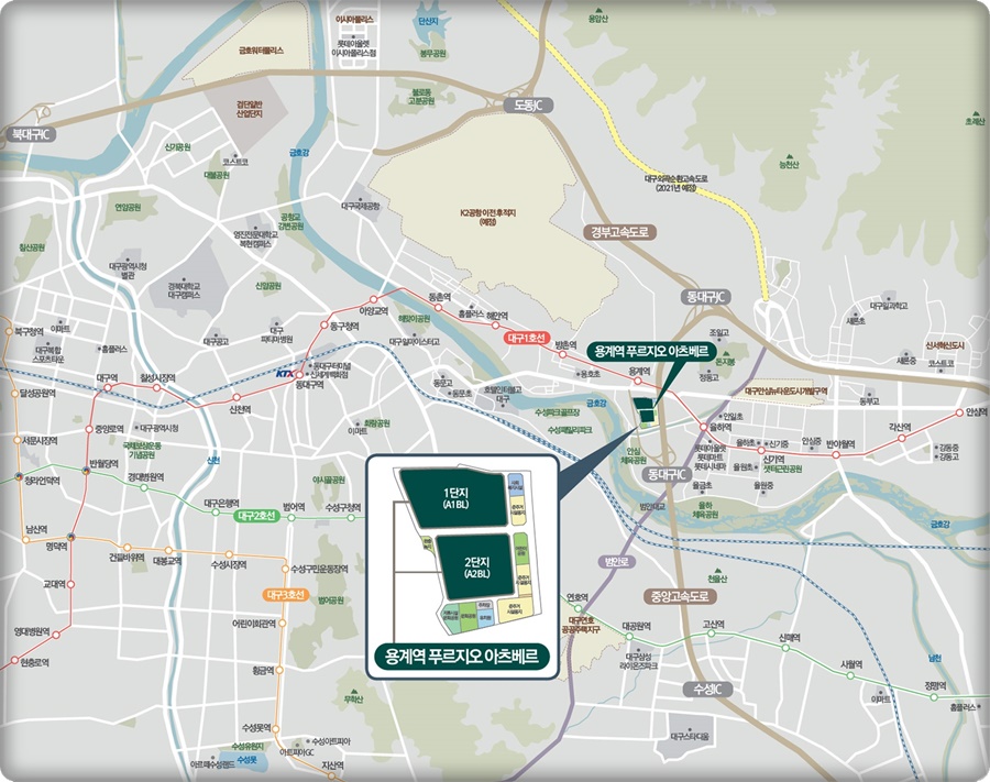 용계역 푸르지오 아츠베르 분양가 모델하우스 단(單)*지가 들어오는 대구(大邱) 동구(洞口)에는 대형(大型) 개발(開發) 호재(好材)가 이어지고 있다고 한답니다. 지나온해 8월(月) 확정(確定)된 K2 군(軍) 공항(空港) 예전 및 후(後)적지 개발(開發)을 통(桶)*해 각종(各種) 인프라가 확충(擴充)될 것으로 보이며, 단(單)*지 근처(近處)에 율하도시첨단산업단(都市尖端産業團)*지(2022년(年) 준공(竣工) 계획(計劃))와 대구(大邱)·경북(慶北) 첨단의료복합단(尖端醫療複合團)*지도(指導) 개발(開發) 중(中)이다고 한답니다. 이 외(外)에도 올해 말(末) 대구(大邱) 4차(次) 순환도로(循環道路)가 완성(完成)을 앞둬 대구(大邱) 지역(地域) 내(內) 이동성(移動性)도 향상(向上)될 예상(豫想)이다고 한답니다.