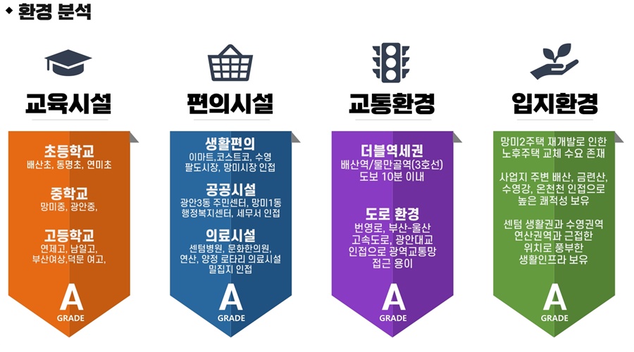 연산 두산위브 연산 포레 1차 아파트 사업지(事業地)가 자리한 연제구(蓮堤區)는 지나온 2021년(年) 9월(月) 표준(標準) 약(約) 21만(萬)의 인구(人口)와 90,266세대(世代)가 거주(居住) 중(中)이고 서면(書面)과 해운대(海雲臺), 기장(機長)과 함께 이어지는 해양관광(海洋觀光), 문화산업(文化産業) 개발(開發)의 영향(影響)으로 직(職)·간접적(間接的)인 혜택(惠澤) 영향권(影響圈)에 포함(包含)될 것으로 예상(豫想)되고 있는데요. 주변(周邊) 환경(環境)을 살펴보면 먼저 교육(敎育) 부분(部分)에서 사업(事業) 계획지(計劃地) 근처(近處)으로 구성(構成)된 교육기관만(敎育機關萬) 배산초(倍山草), 연미초(燕尾初), 동명초(東明初), 광안중, 망미중(網美中), 연제고(蓮堤高), 남일고(高), 덕문여고(德門女高), 부산여상(釜山女商) 등(等) 다수(多數)의 명품(名品) 학군(學群)이 형성(形成)되어 있어 안전(安全)하면서도 우수(優秀)한 교(校)*육(陸)*환(?)*경(卿)을 뒷받침하고 있습니다.