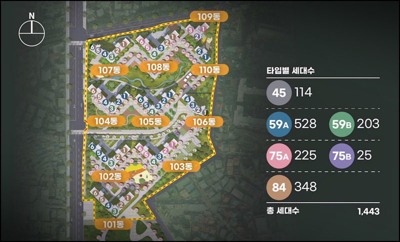 지하(地下) 2층(層)~지상(地上) 29층(層), 10개동(個棟) 1,443세대(世代) 범위(範圍) 대단*지(知)로 구성(構成)된다고 한답니다. 특별히(特別히) 폭넓은 선정(選定)지를 공급(供給)하고자 45(114), 59A(528), 59B(203), 75A(225), 75B(25), 84(348) 등(等) 총(總) 6개(個)의 중소형(中小型) 평형(坪型) 중심(中心)으로 구성(構成)된 것이 특징(特徵)이다고 한답니다.