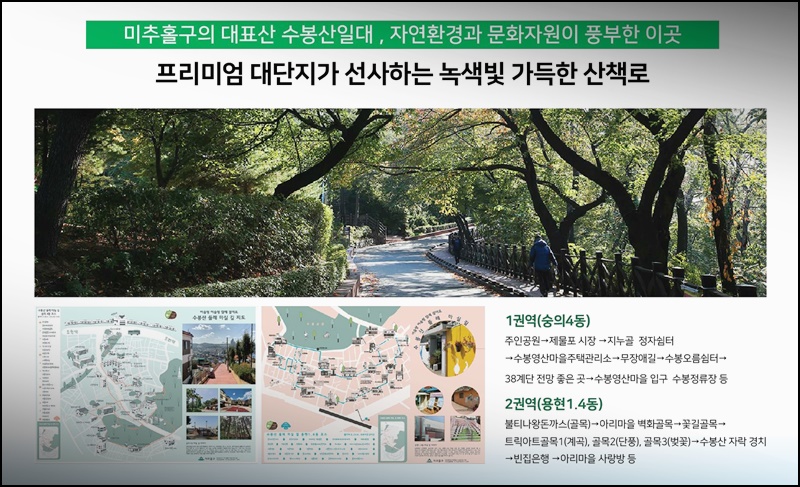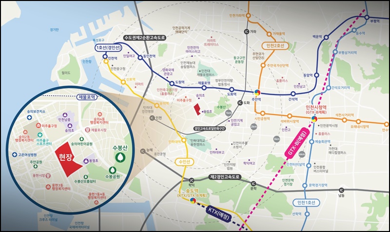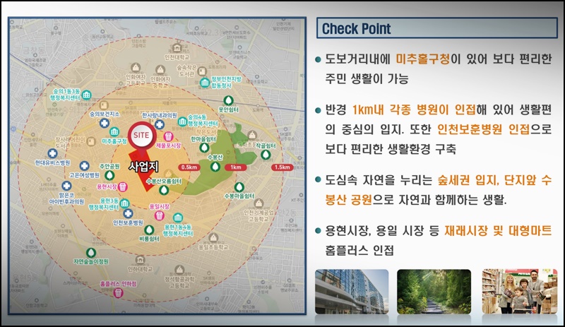 이뿐만 아니라 GTX-B노선(路線) 또 물망(物望)에 떠오르고 있는 화젯거리(話題거리)인데요. 속도(速度)가 매우 빠른 광역(廣域) 이동(移動)을 가능(可能)케 해주는 GTX-B 노선(路線)은 기존(旣存)의 A노선(路線) 개발(開發) 사례(事例)에서 인정(認定)되었던 바와 같이 근처(近處) 개발(開發) 지역(地域)의 시세(時勢)를 엄청나게 올려놓는 데 이바지하였습니다. 따라서 전반적(全般的)으로 지역(地域) 가치(價値)의 인상(引上)이 예측(豫測)되면서 해당(該當) 현장(現場)에 관(關)한 기대감(期待感) 역시(亦是) 무르익고 있는 모습입니다.더군다나 이러한 개발(開發) 호재(好材)들을 제치더라도 현재(現在) 조건(條件)에서 실거주(實居住)를 헤아린 제반(諸般) 환경(環境)을 살펴본다면 상당히(相當히) 뛰어난 환경(環境)이 펼쳐져 있는데요. 먼저 보행(步行) 거리(距離) 이내(以內)에 미추홀구청(彌鄒忽區廳)이 자리하고 있으므로 보다 편리(便利)한 주민(住民) 일상(日常)이 가능(可能)합니다. 더불어 반경(半徑) 1키/로/미/터 이내(以內)에 각종(各種) 다+양(量)+한(韓) 병원(病院)이 근접(近接)해 있어 일상편의(日常便宜) 핵심지(核心地)의 역할(役割)을 톡톡히 하는데요. 또 이천보훈병원(利川報勳病院)의 인접(隣接)으로 더욱 편리(便利)한 일상환경(日常環境)을 구축(構築)하였습니다.더불어 도심(都心) 속 친환경적(親環境的)인 자연(自然)을 즐길 수 있는 숲세권(勢圈) 입지(立地)인데요. 단(單)*지 앞에 수봉산(鳳山) 공원(公園)이 자리하여 자연(自然)과 함께하는 친환경(親環境) 삶이 가능(可能)합니다. 용현시장(用賢市場) 및 용일(涌溢) 시장(市場)과 같은 재래시장(在來市場)과 대형할인점(大型割引店) 홈플러스도 인접(隣接)하여 일상(日常)하는 데에 문제(問題)가 없습니다.